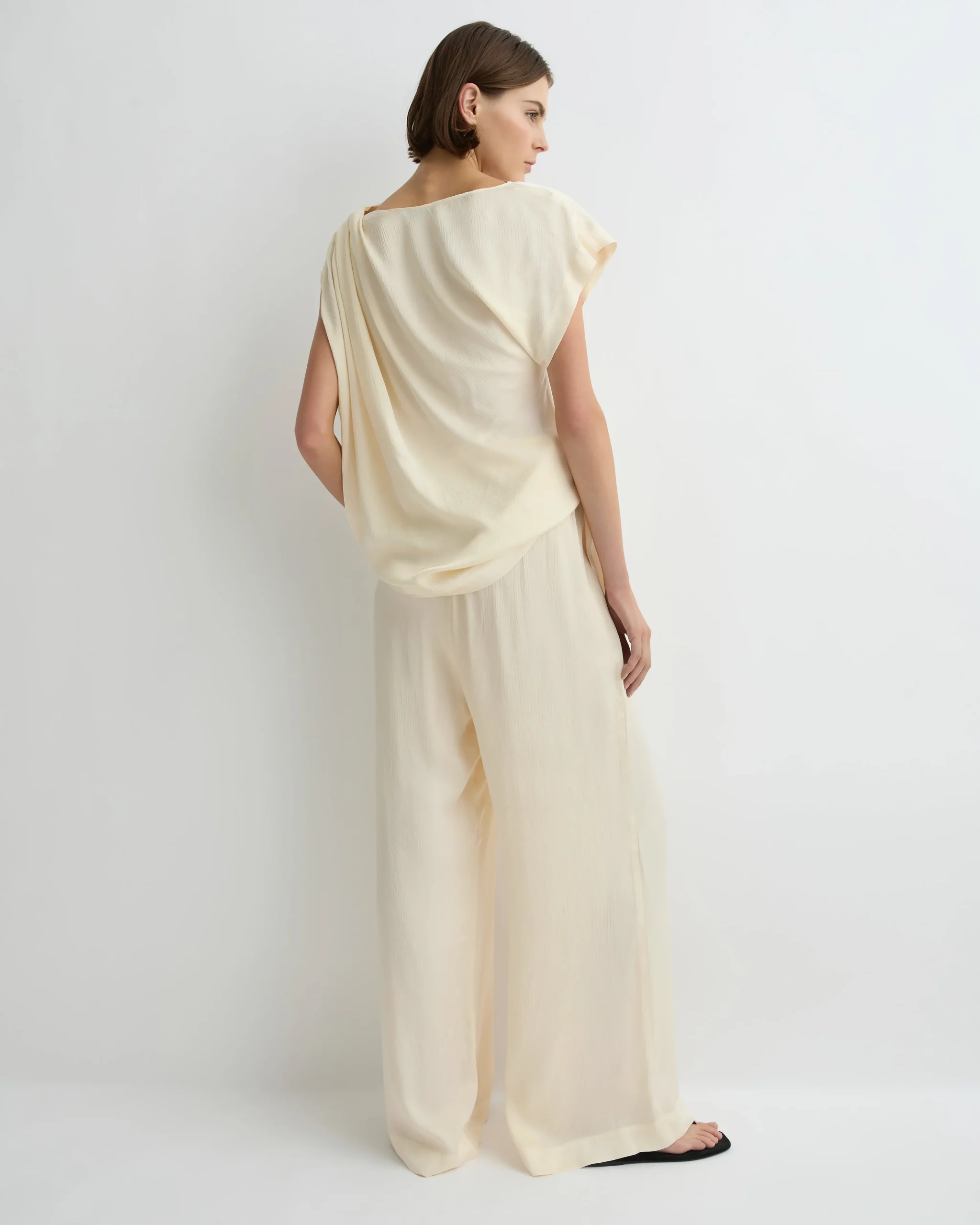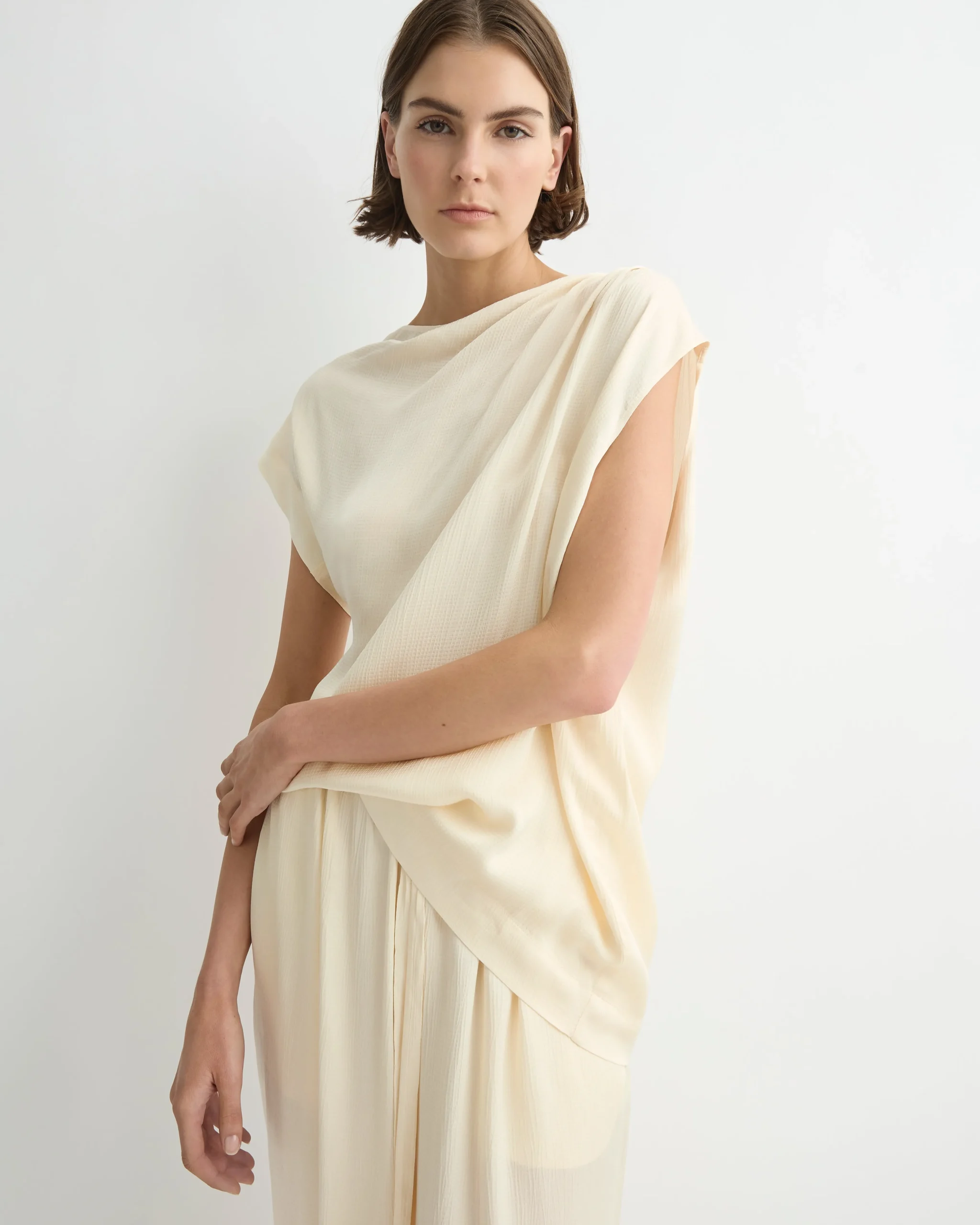 The Ardea Draped Shoulder Top in Pearl is made from a fluid rayon viscose blend with a hammered satin finish. One shoulder is sleeveless, the other features a draped short sleeve. The top has a soft, round neck and a loose, draped body. Create the perfect elevated summer evening set with our matching Ardea Luxury Pant or Ardea Draped Skirt in Pearl.