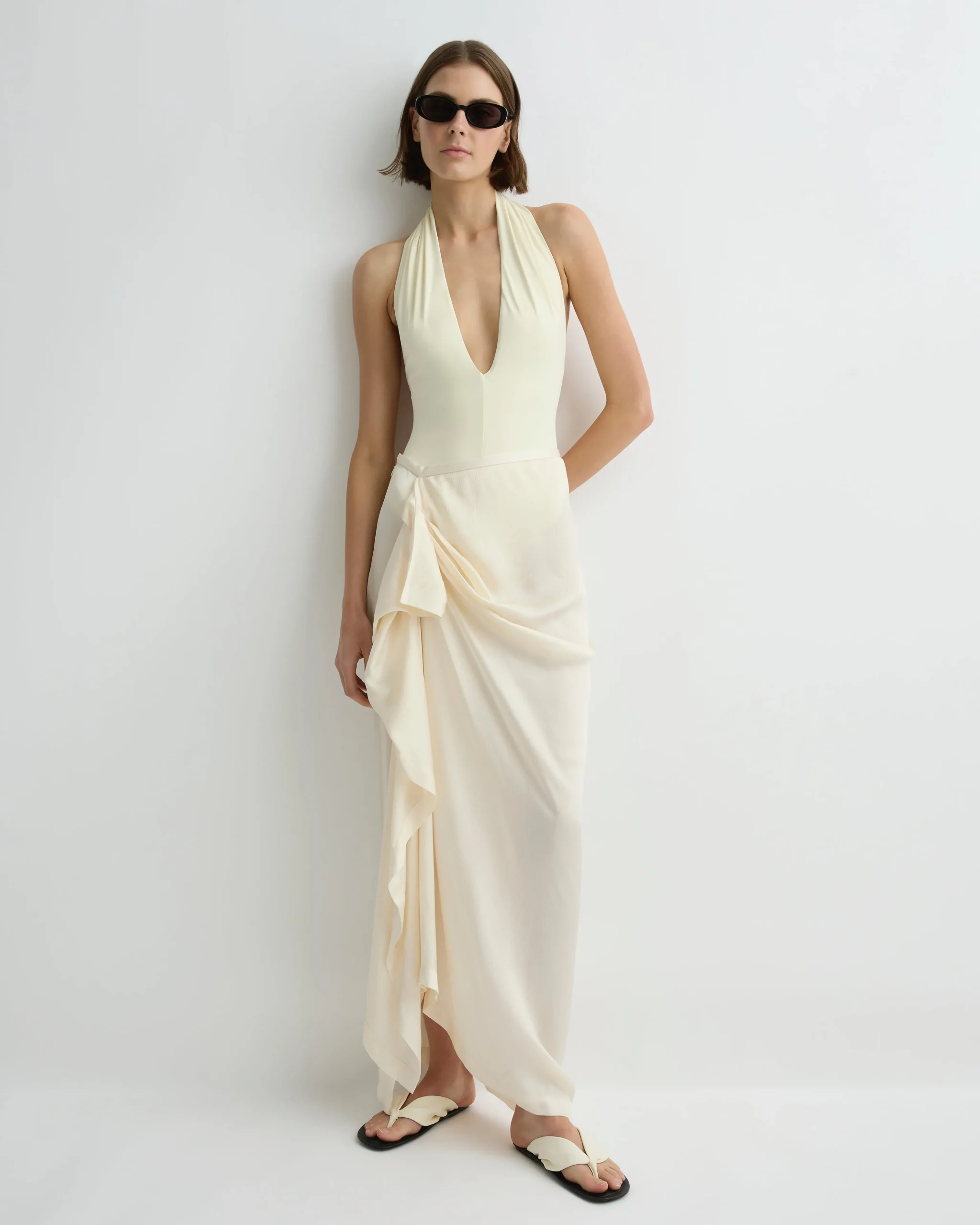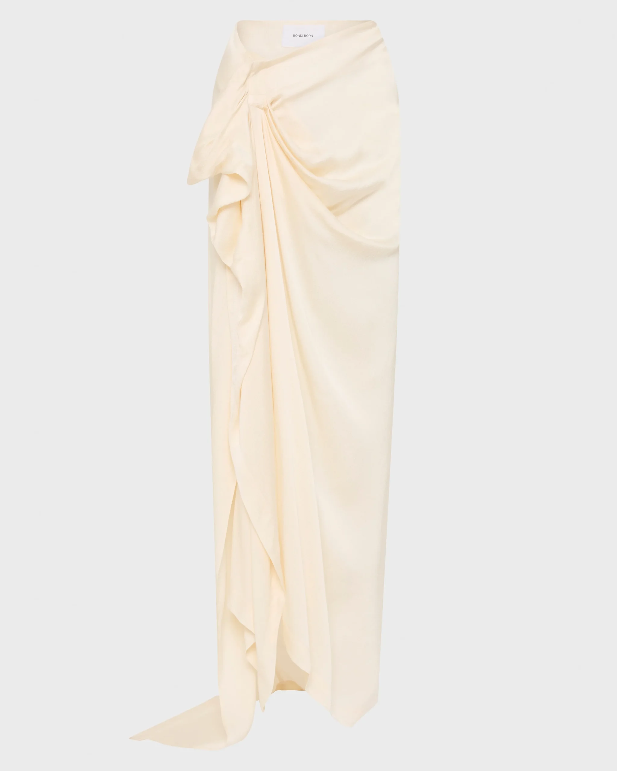 The Ardea Draped Skirt in Pearl is an elegant and versatile wardrobe staple crafted from a fluid rayon viscose blend with a hammered satin finish, chosen for its elegant drape. This floor length draped cream skirt features flattering draping across the left hip and a zip closure at centre back. Pair with matching Ardea tops in Pearl, or throw over Bondi Born swimwear in Pearl or Porcelain.