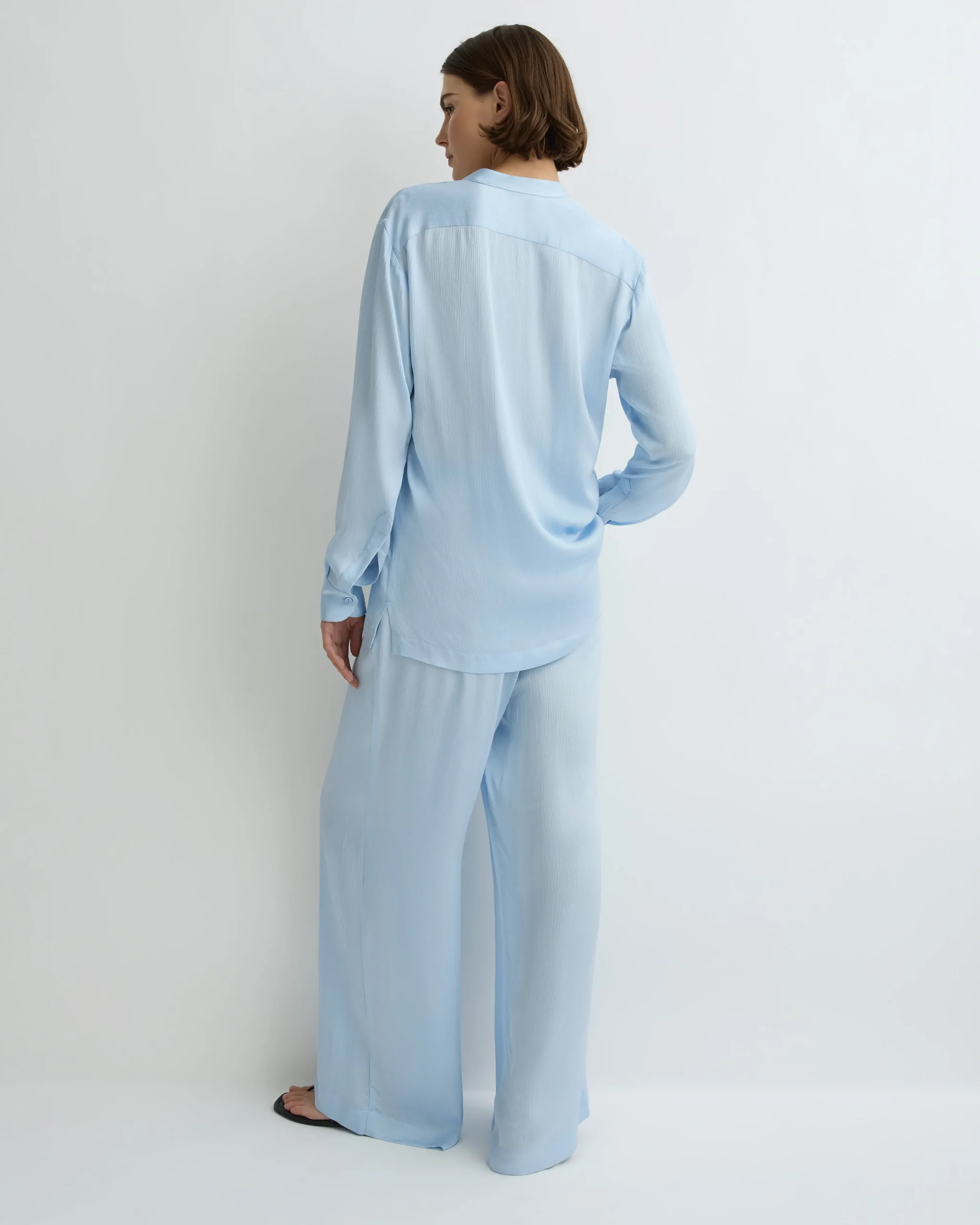 The Ardea Long Sleeve Shirt in Hydrangea is crafted from light, cool, sustainable European hammered satin with a relaxed yet elevated feel. This long-line style shirt features a mandarin collar, drop shoulders and hemmed cuffs which are finished with Japanese buttoning. Designed to skim the body, the shirt pairs perfectly with the Ardea Luxe Pant in Hydrangea for a chic, modern take on the pantsuit that is deal for day-to-night dressing. Style with sandals for an effortlessly polished dinner look.