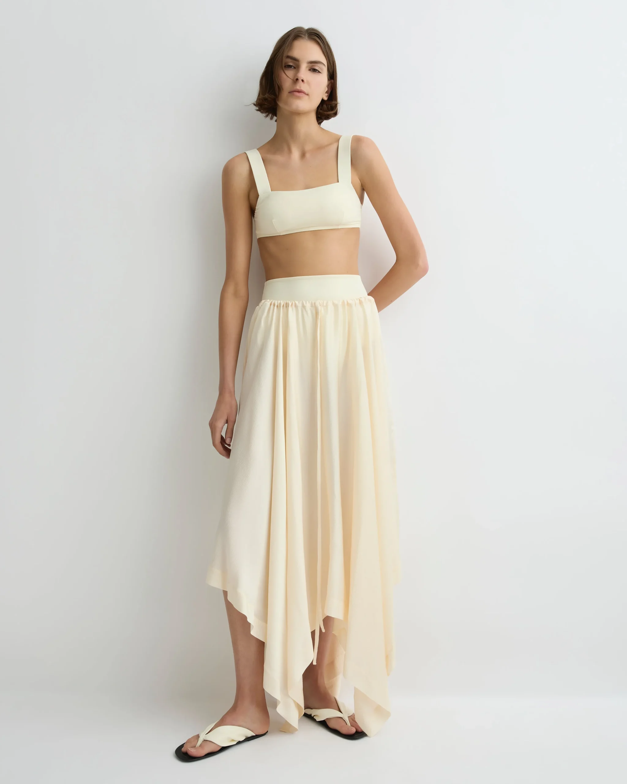 The Ardea Square Long Skirt in Pearl is crafted from a luxurious, sustainable, European hammered satin, loved for its cool hand-feel and fluid drape. Relaxed in style, the skirt features an elasticated tie waist, side splits to the knee, and a distinctive square hemline. Style it with the Ardea Kimono Top in Pearl for an effortlessly elegant set, or layer over Bondi Born swimwear in Porcelain or Pearl for a chic resort look.