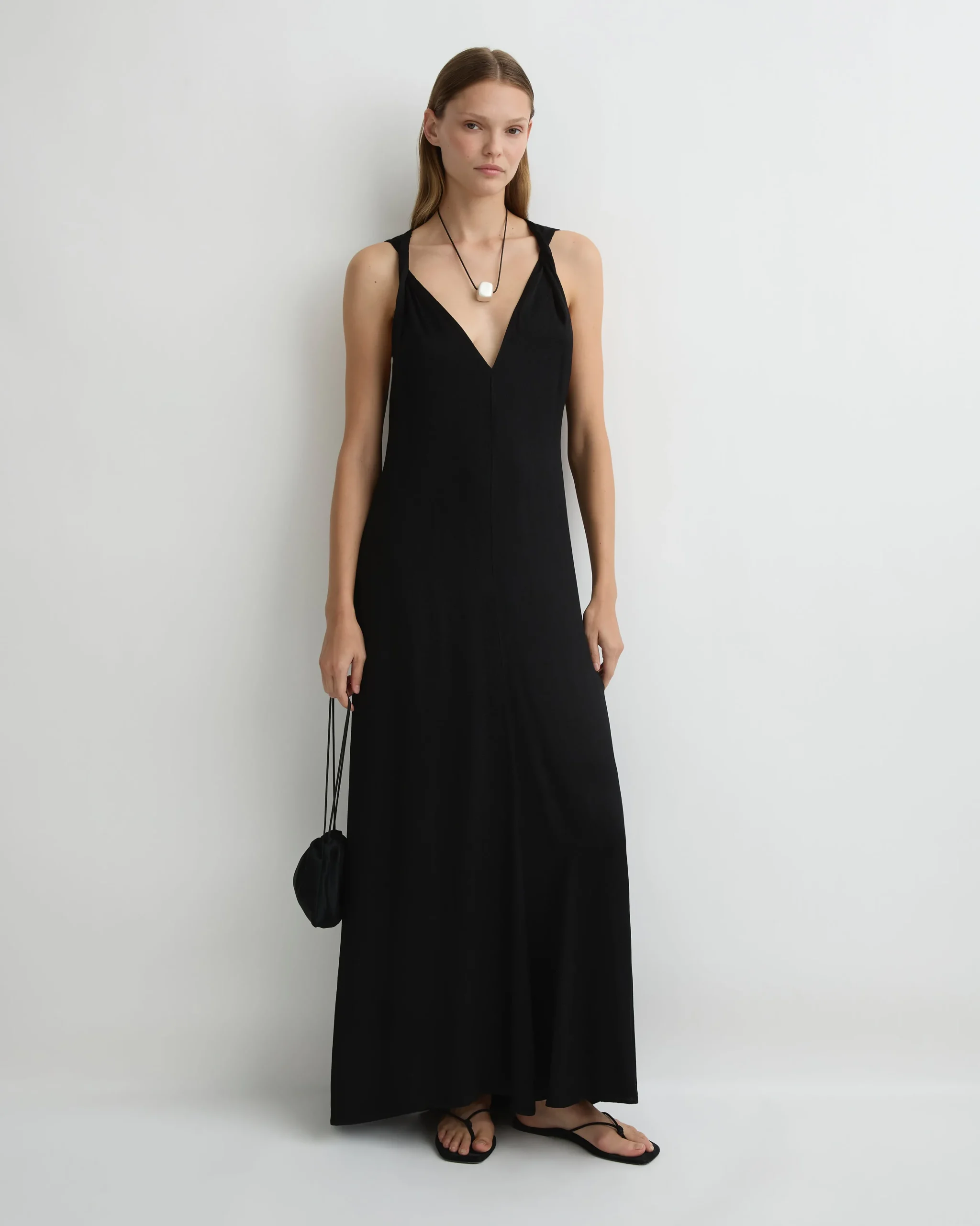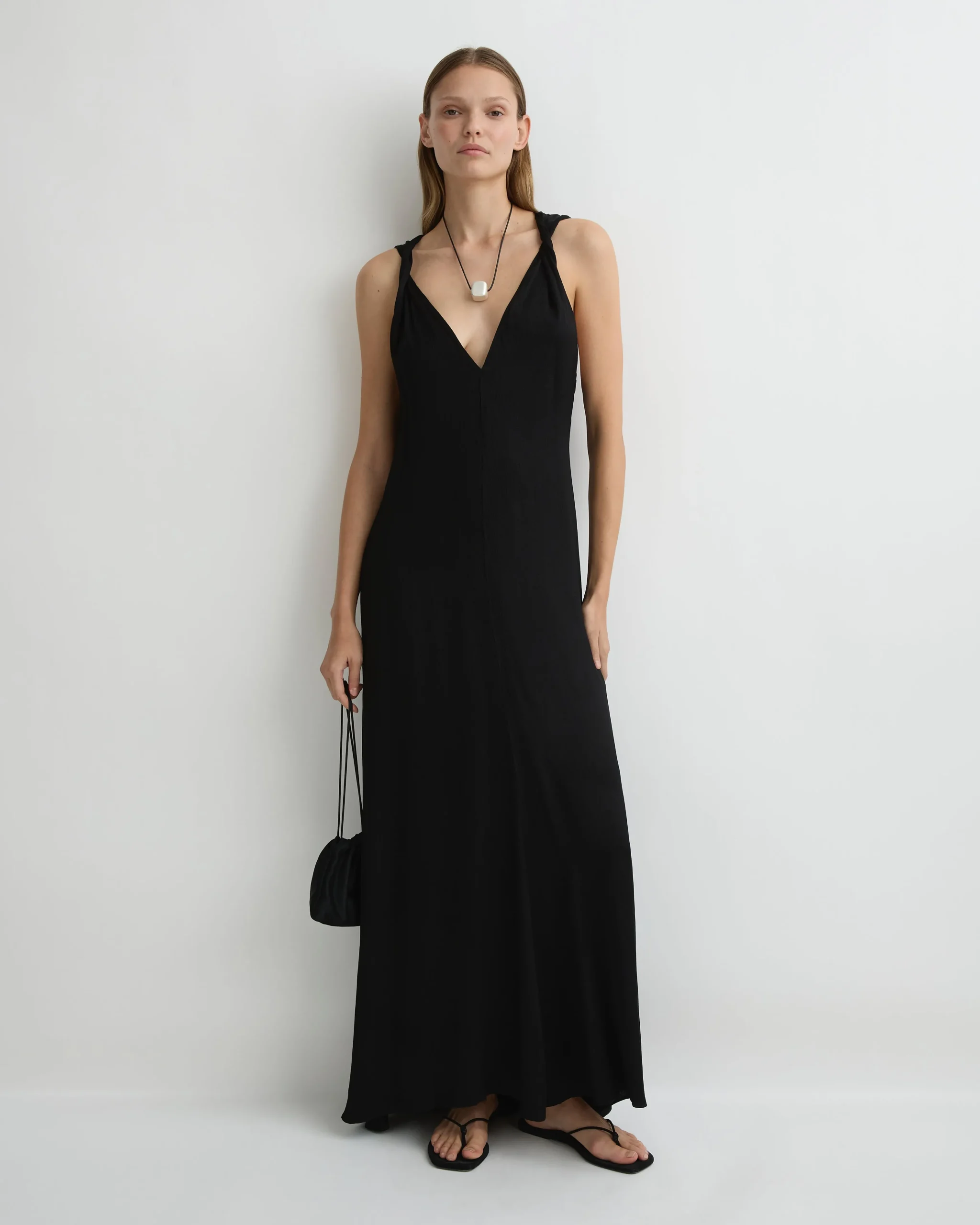 The Ardea Twist Shoulder Maxi Dress in Black is a sophisticated and timeless silhouette, perfect for elegant evening occasions. Crafted from a luxurious viscose blend with a hammered satin finish, this sleeveless style is defined by its plunging neckline and intricate twists on the shoulder straps, which add a unique design element. The flowing skirt falls gracefully to the ankles, while an invisible zip at the center back ensures a seamless fit.