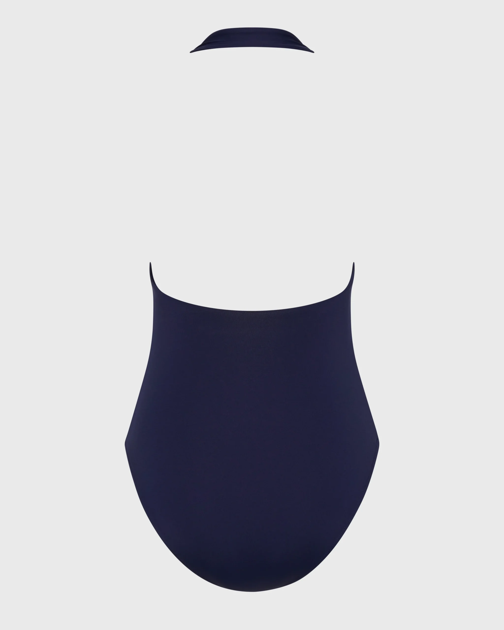 The Candice One Piece in classic Maritime navy is an elegant halterneck swimsuit with timeless appeal. Featuring a wide, elasticated strap that runs from under the arms to around the neck, Candice offers comfort and a flattering fit. A scoop back highlights the shoulders, while the clean, feminine silhouette transitions effortlessly from beach to bar, also working beautifully as a bodysuit. Candice is self-lined in our luxuriously soft Italian Embodee™ fabric, which is sustainably made and offers gentle shaping power to refine the silhouette. A versatile piece designed to remain a favourite in your summer wardrobe for years to come. Team with Bondi Born white and navy resort wear.