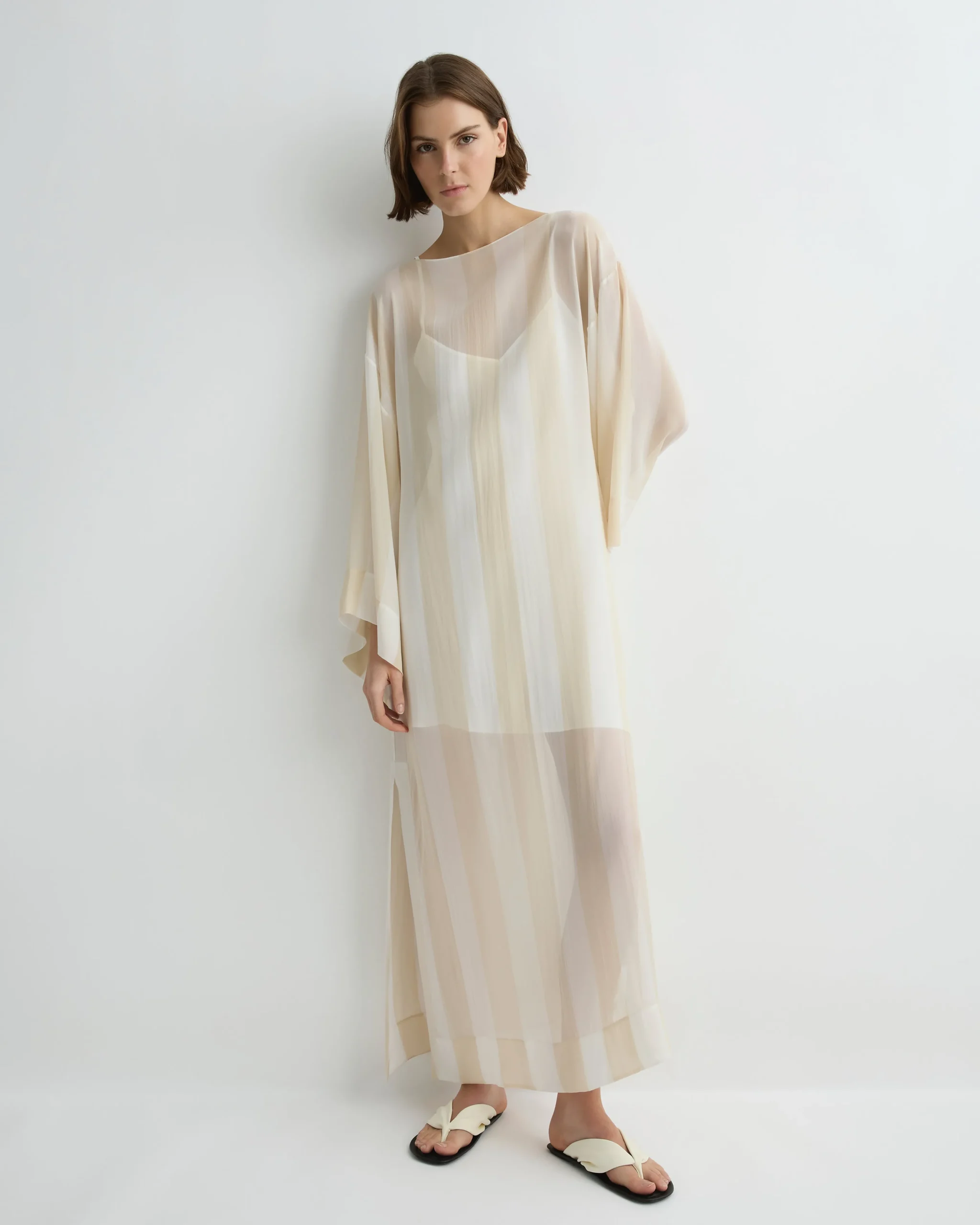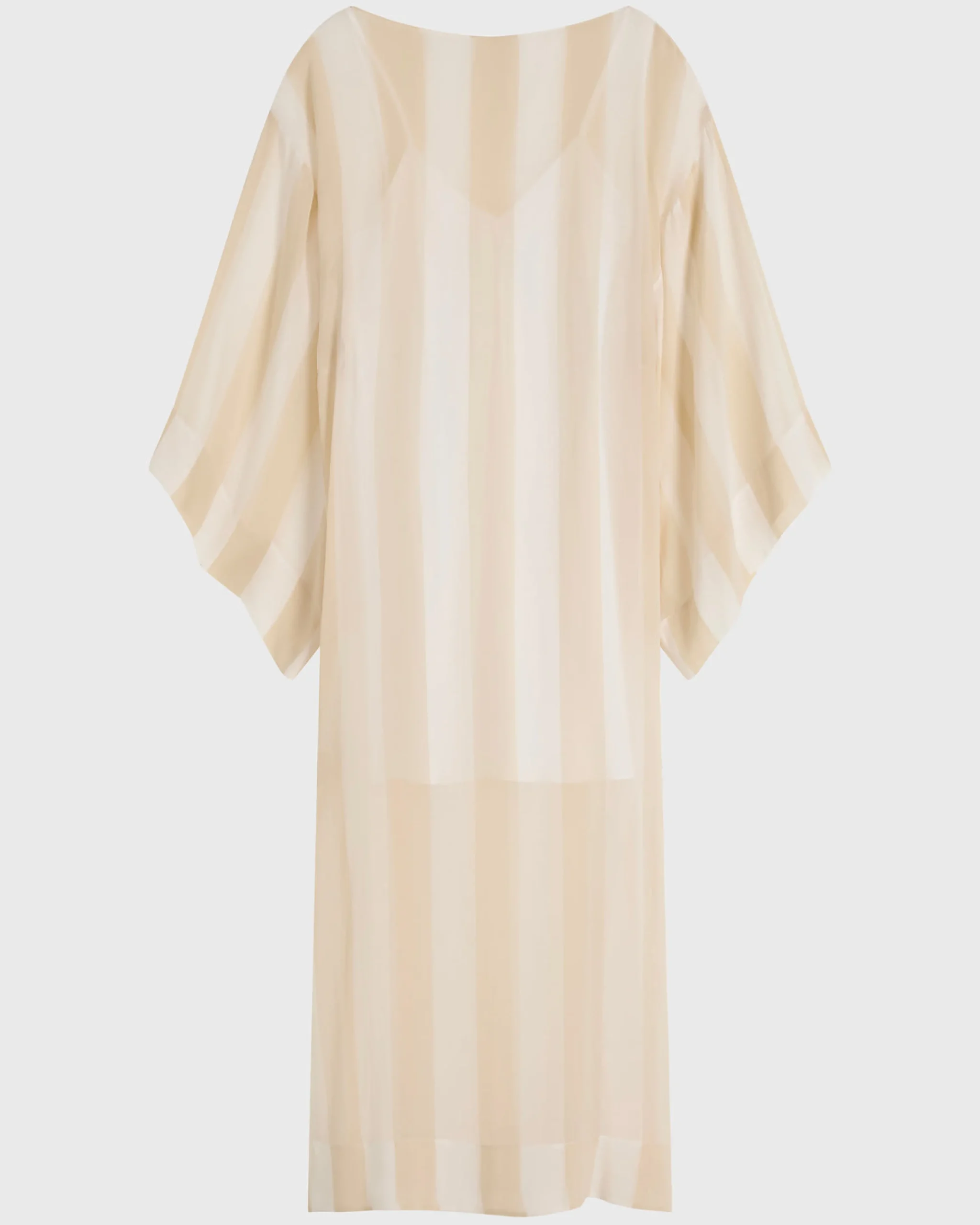 Featuring wide kimono sleeves and a soft boat neckline, the limited-edition Capri Silk Kimono Sleeve Maxi in ecru stripe offers effortless elegance in sheer silk georgette. Side splits and a full-length silhouette create fluid movement, complemented by an internal slip for coverage.