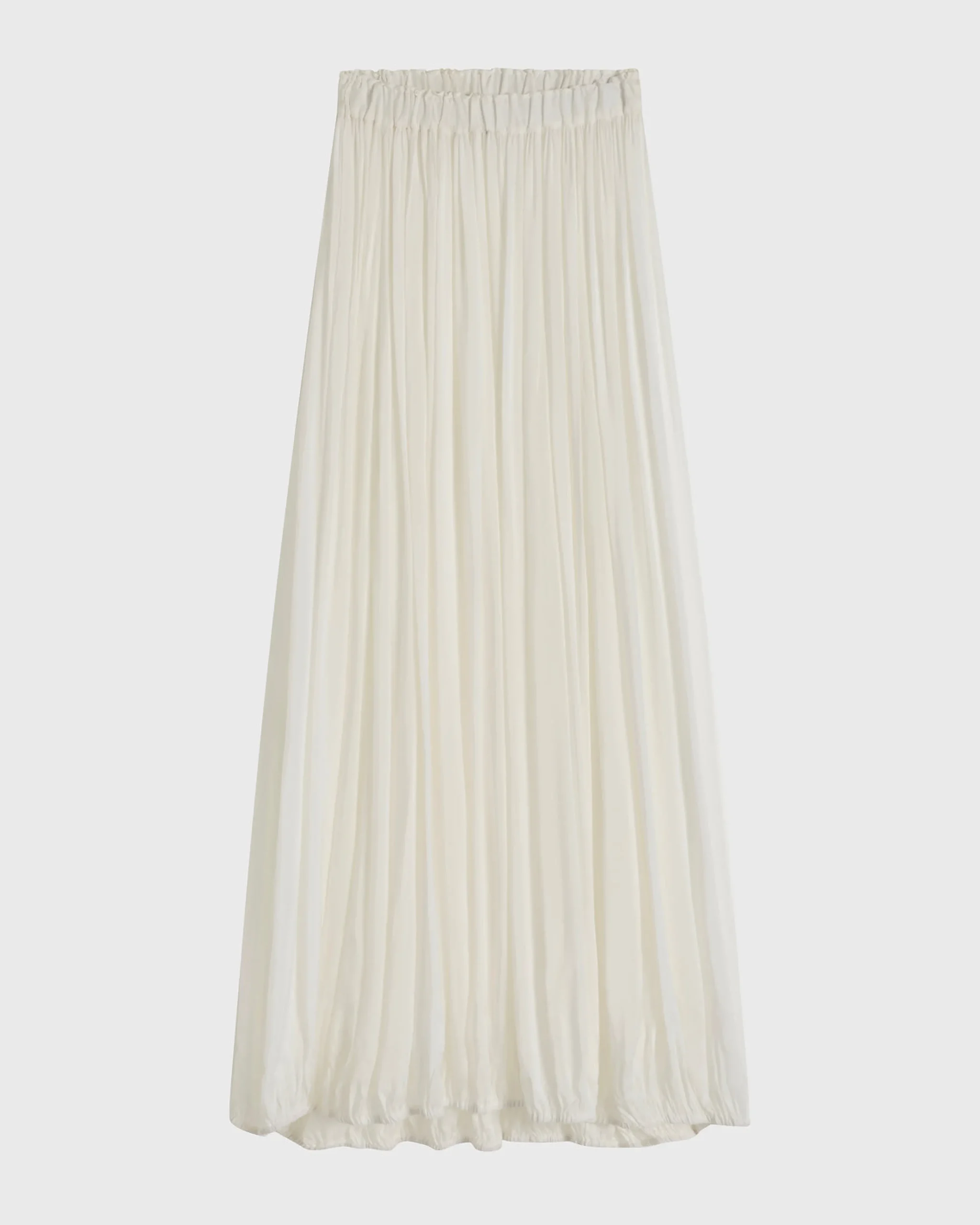 The limited-edition Cremona Balloon Skirt in white offers a modern, voluminous full-length silhouette cut from sheer European voile. Its elastic waist and hem create gentle architectural shape while maintaining effortless movement. An elevated warm-weather piece that feels both refined and weightless.