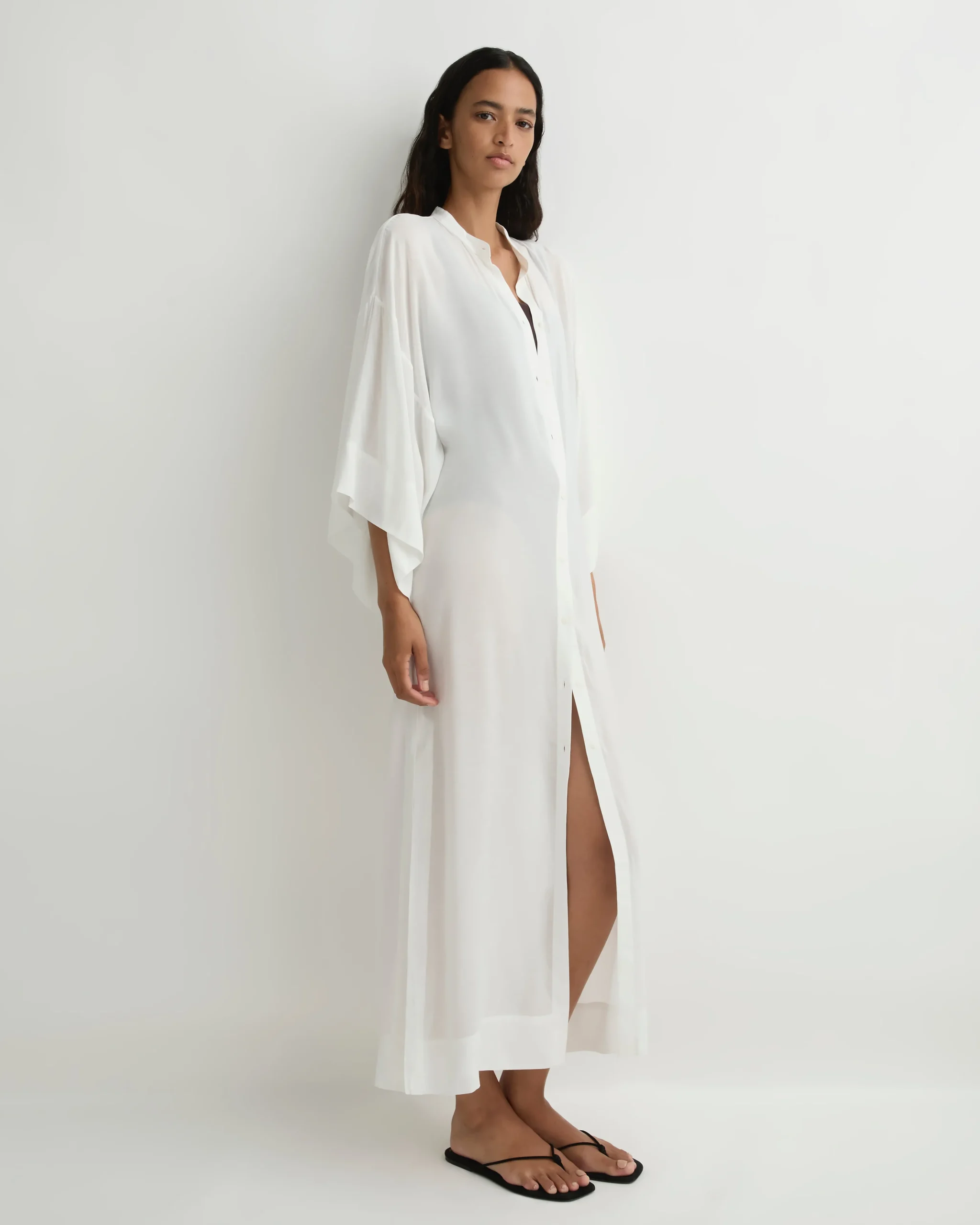 The Cremona Kimono Sleeve Coverup in white is an elevated sheer, summer dress that makes the perfect pool-side cover-up. Made from a soft, cool, rayon voile, this long dress falls to the ankles and features Japanese buttons from neck to hem. Wear over swimwear or with a white slip for balmy evenings.