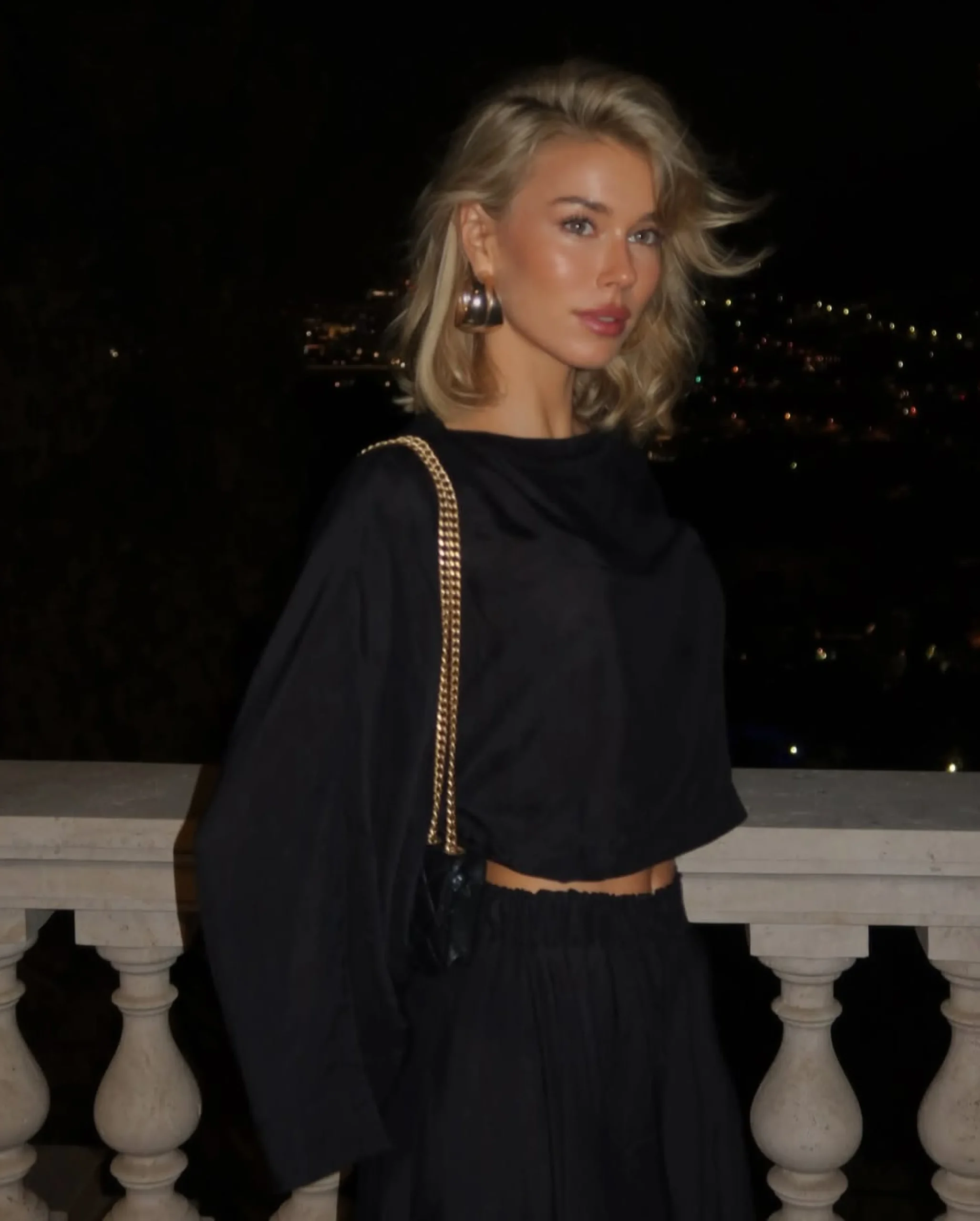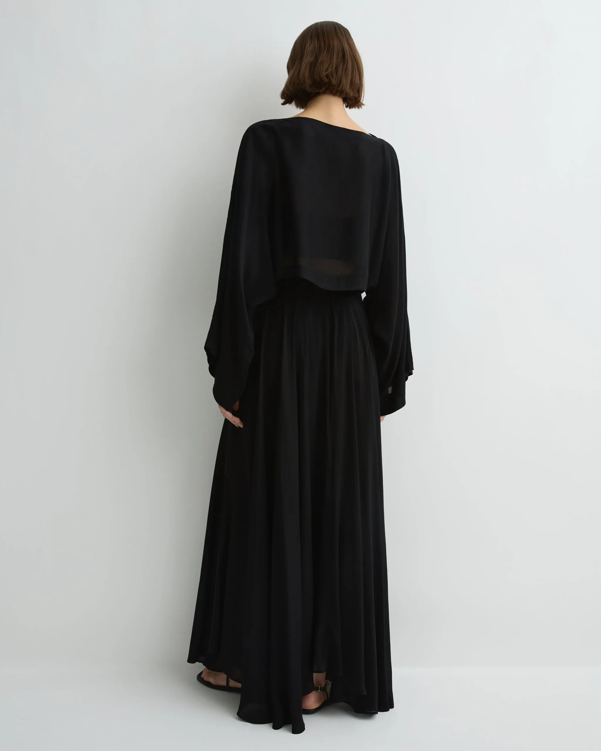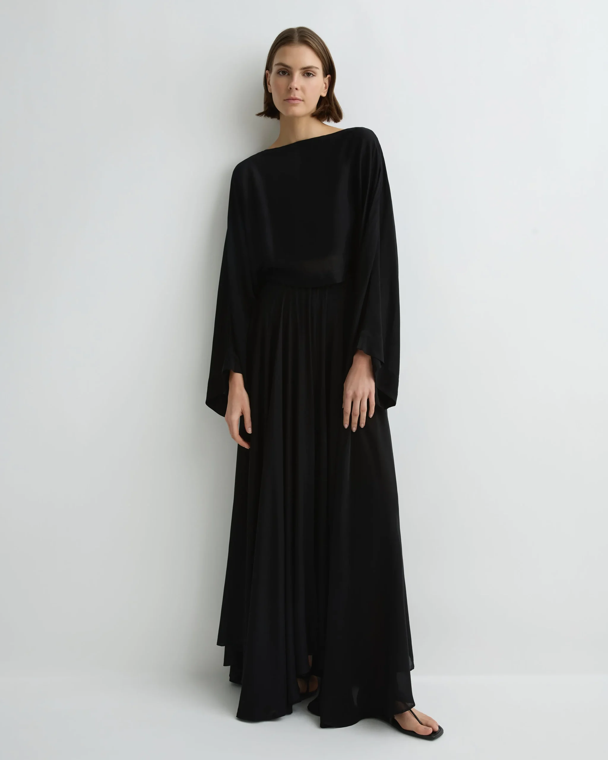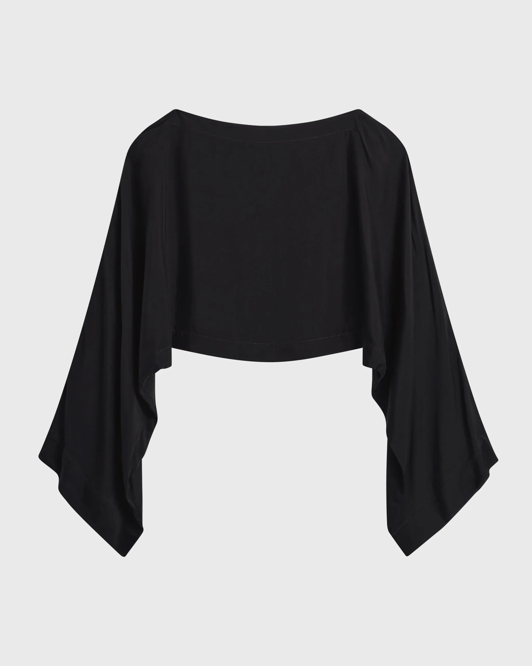 The Cremona Kimono Top in Black is a timeless design crafted from sheer, lightweight, sustainable European rayon voile. This long-sleeve, cropped top features a boat neckline and flowing kimono sleeves. Perfect for pairing with Cremona Maxi Skirt or Cremona Sheer Pant this versatile piece transitions seamlessly from day to evening.