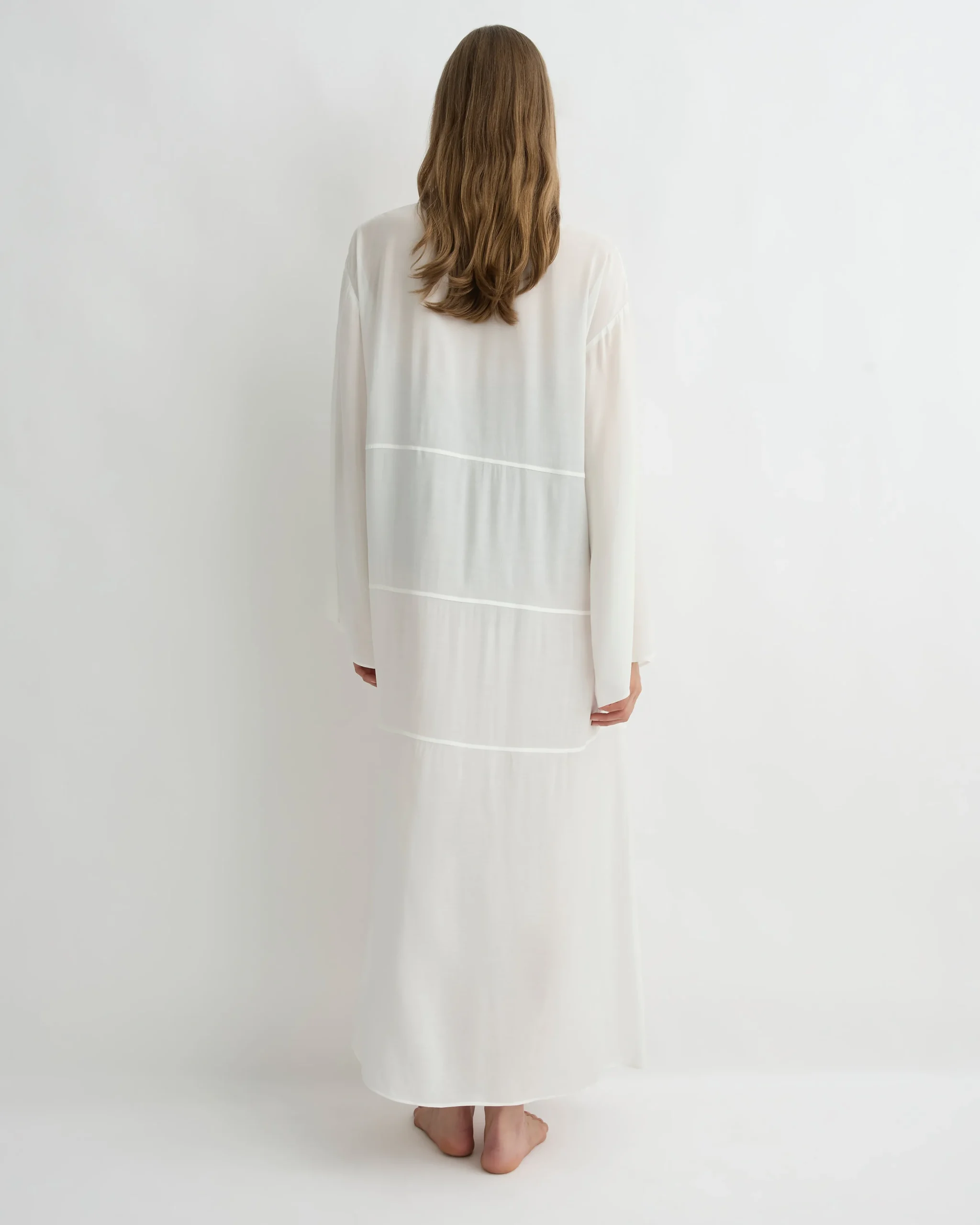 The Cremona Tie-Front Maxi Coverup in White is a flowing, lightweight layer crafted from soft European rayon voile. Defined by its gently flared silhouette, panelled seams and relaxed long sleeves, this maxi-length design fastens with an elegant tie-front closure. Cut for a relaxed fit with flexible sizing, it slips easily over swimwear for effortless resort styling.