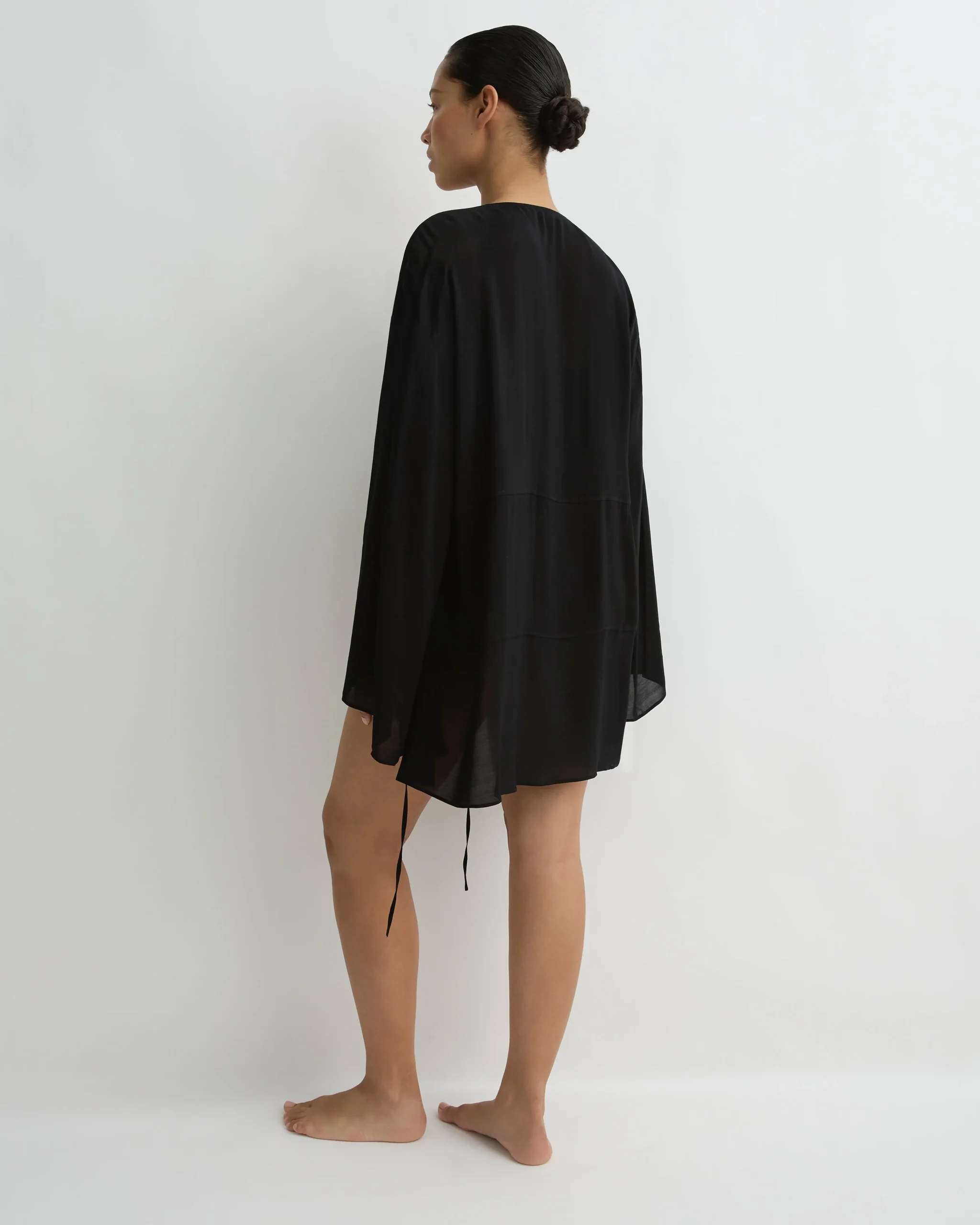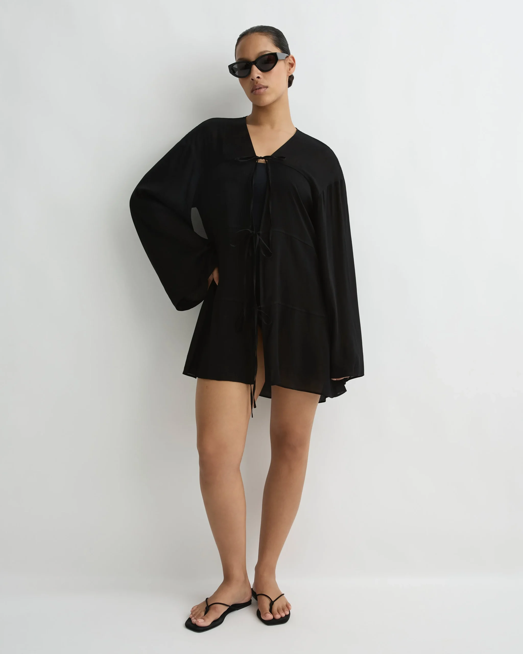 The Cremona Tie-Front Mini coverup in black is an elegant hot summer day option. A chic take on a beach to bar cover-up, the long-sleeve mini features four horizontal panels with shoestring ties at centre front. Made from a soft, sheer rayon voile, this elegant and versatile piece can also be worn over shorts or jeans with a black bikini top or bra worn underneath.