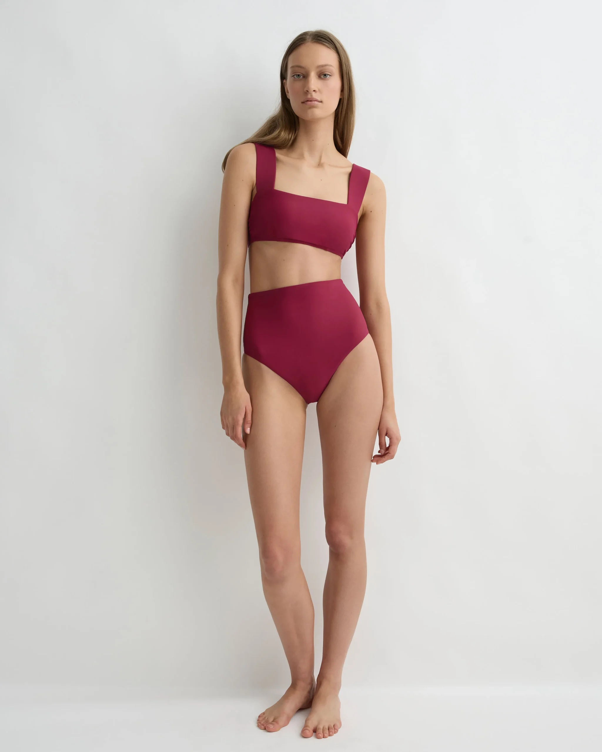 The Elle Bikini Top in limited-edition mulberry is a minimal square neck design featuring extra-wide elasticated shoulder straps, gathers at the side bust to shape the bust, invisible under-bust support, removable cups and a branded back clip. Elle is is self-lined with a lighter, luxuriously soft version of Sculpteur® for weightless comfort, making it as enduring as it is flattering.