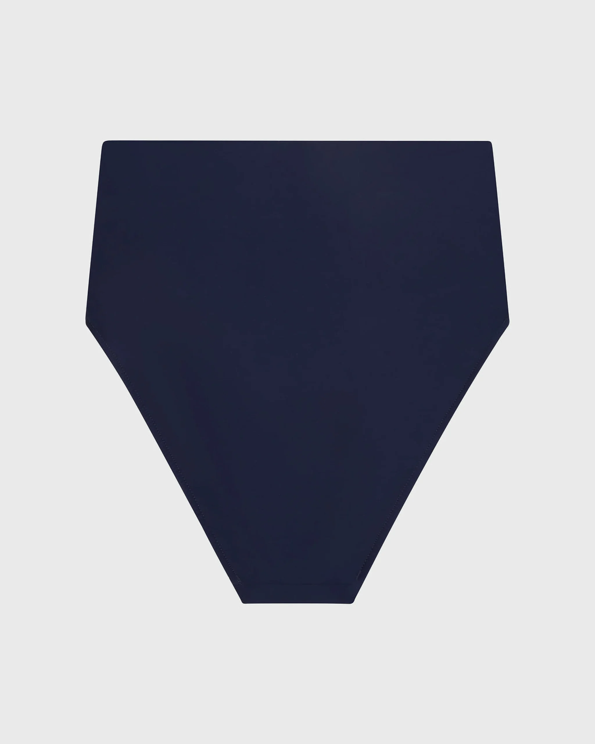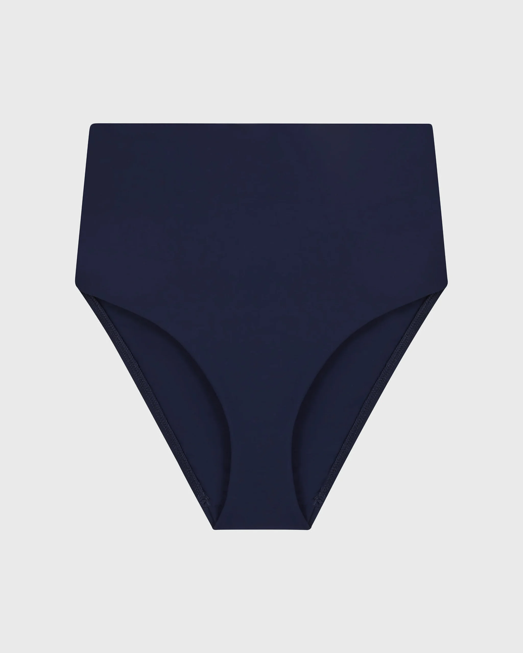 The Faith Bikini Bottom in Navy is designed in our best-selling cut, featuring a super high waist and regular bottom coverage. Crafted from our luxury, technically advanced Sculpteur® fabric that is sustainably made in Italy, this versatile piece has a soft top edge that can be worn high above the waistline for maximum coverage or folded down to sit on, or below, the waist. Sculpteur® employs a patented 3-D stretch technology to smooth the silhouette and lasts up to 10 times longer than standard swim fabrics. Faith is self-lined with a lighter, luxuriously soft version of Sculpteur® for weightless comfort, making it as enduring as it is flattering.