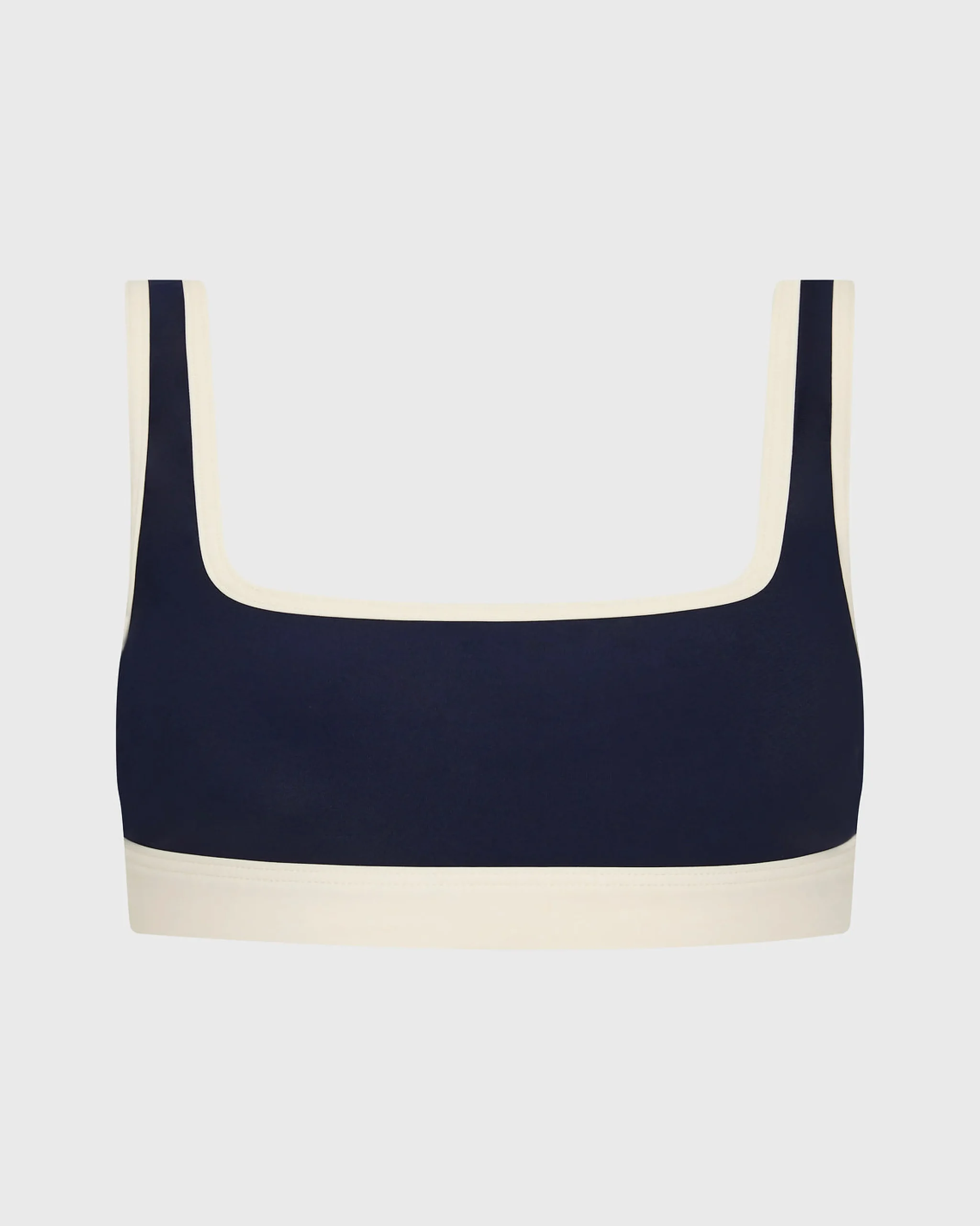 The Hayden bikini top in Navy & Pearl has a chic, classic square neck that features contrasting bind in creamy Pearl. Hayden is made using our technically advanced Sculpteur® fabric with 3-D stretch, that supports the bust. The bikini top features invisible under-bust support. The back has a V line and a branded clip. Style Hayden with our matching Jayde Bikini Bottom in Navy & Pearl.
