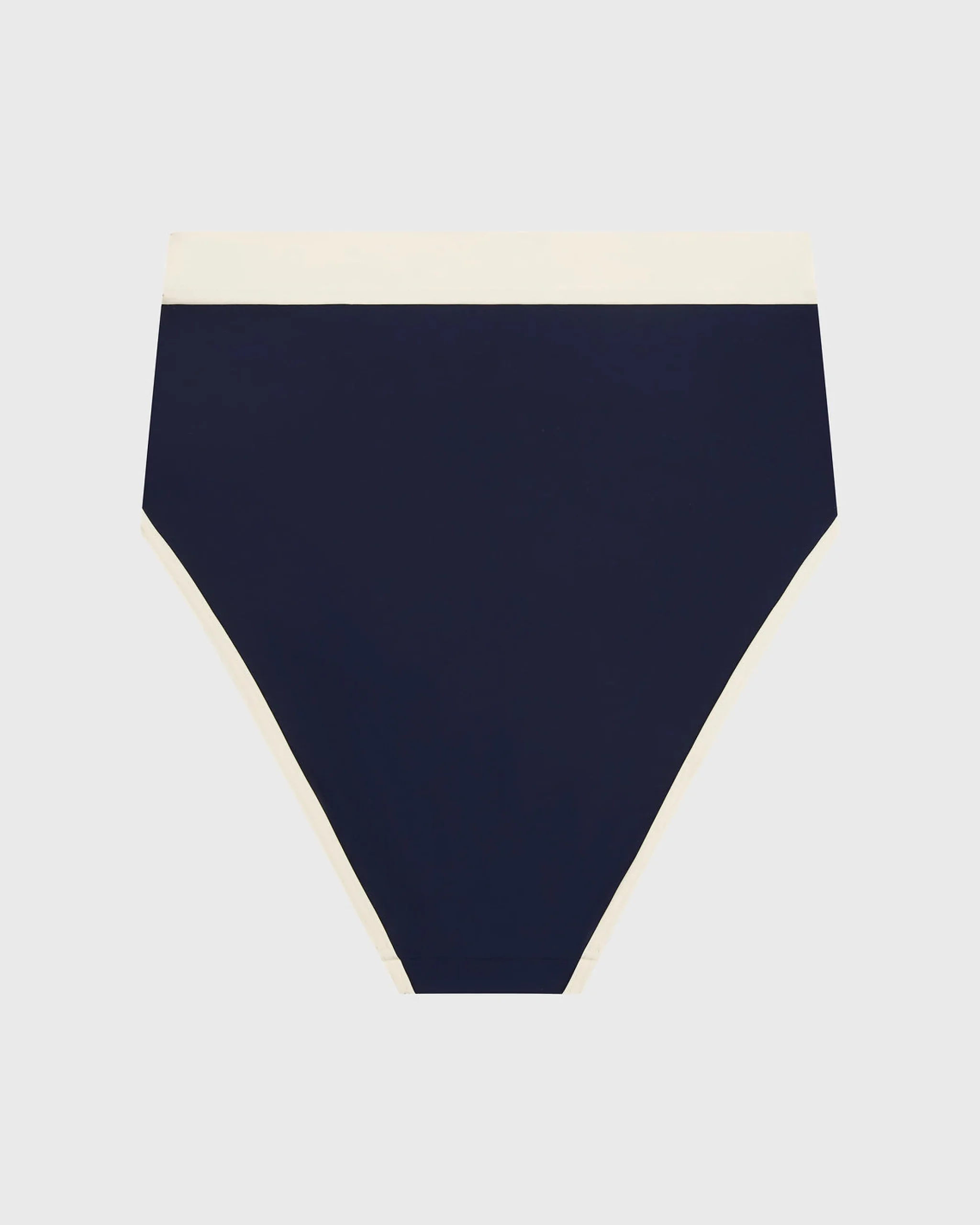 The Jayde Bikini Bottom in Navy & Pearl is made using our unique Sculpteur® fabric that smooths and supports with a patented 3-way stretch technology. This flattering, high waisted bikini bottom assists with tummy control, featuring a soft waistband in contrasting pearl trim that ends above the waistline and has a regular leg line. Pair with our matching Hayden bikini top in Sculpteur® fabric.