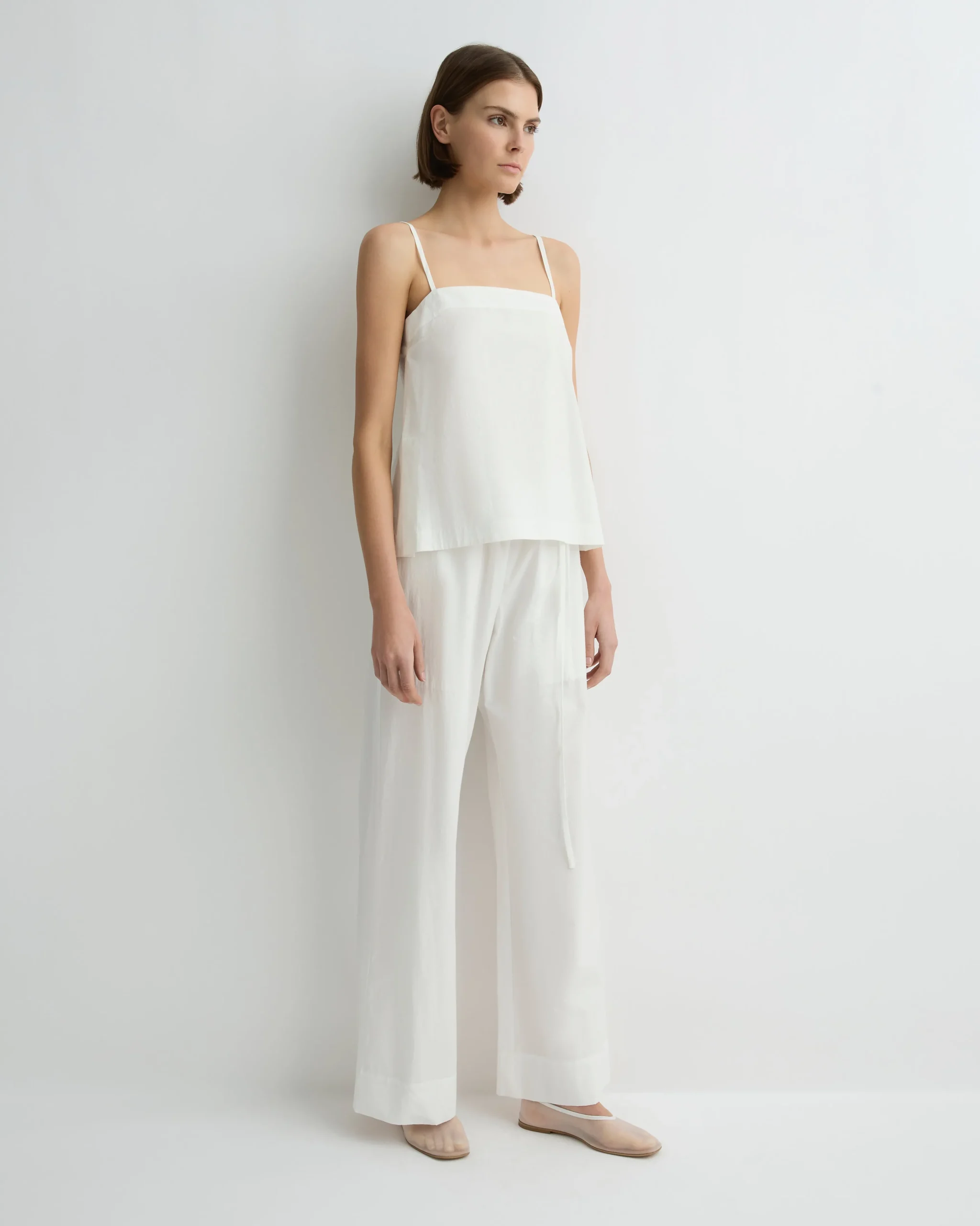 The Kyoto Cami in White is a refined warm-weather staple, crafted from crisp Japanese dry cotton poplin. This minimalist silhouette features a straight neckline, slender adjustable straps and side splits, with elastic at the back for a comfortable fit. Effortlessly versatile, it pairs seamlessly with our matching Kyoto Pant or Kyoto Short.