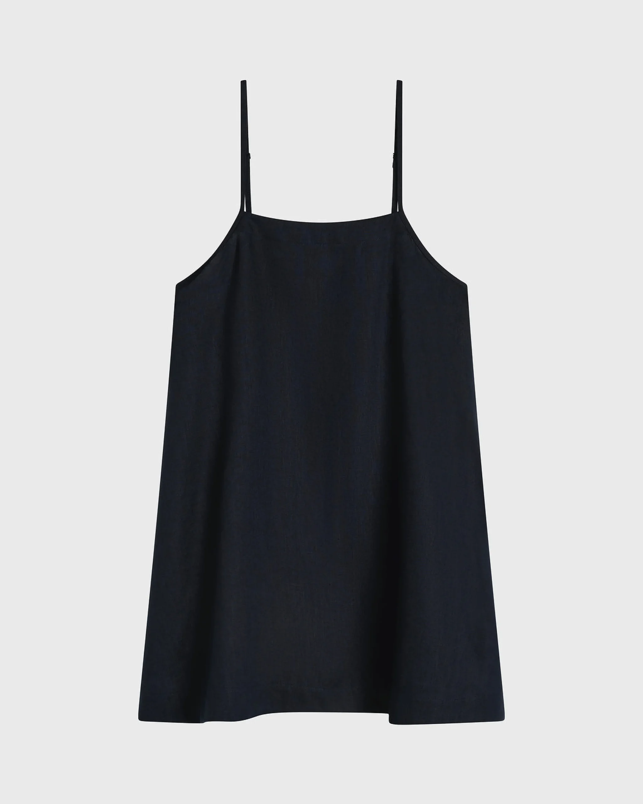 The Leiden Flared Mini Dress in Navy is a playful yet refined silhouette, cut from lightweight linen repurposed from deadstock fabrics. This camisole-style dress features a fitted neckline and bust with slender adjustable straps, falling to a softly flared mini-length hem. Finished with discreet side pockets, it offers gentle ease and movement for relaxed summer days.