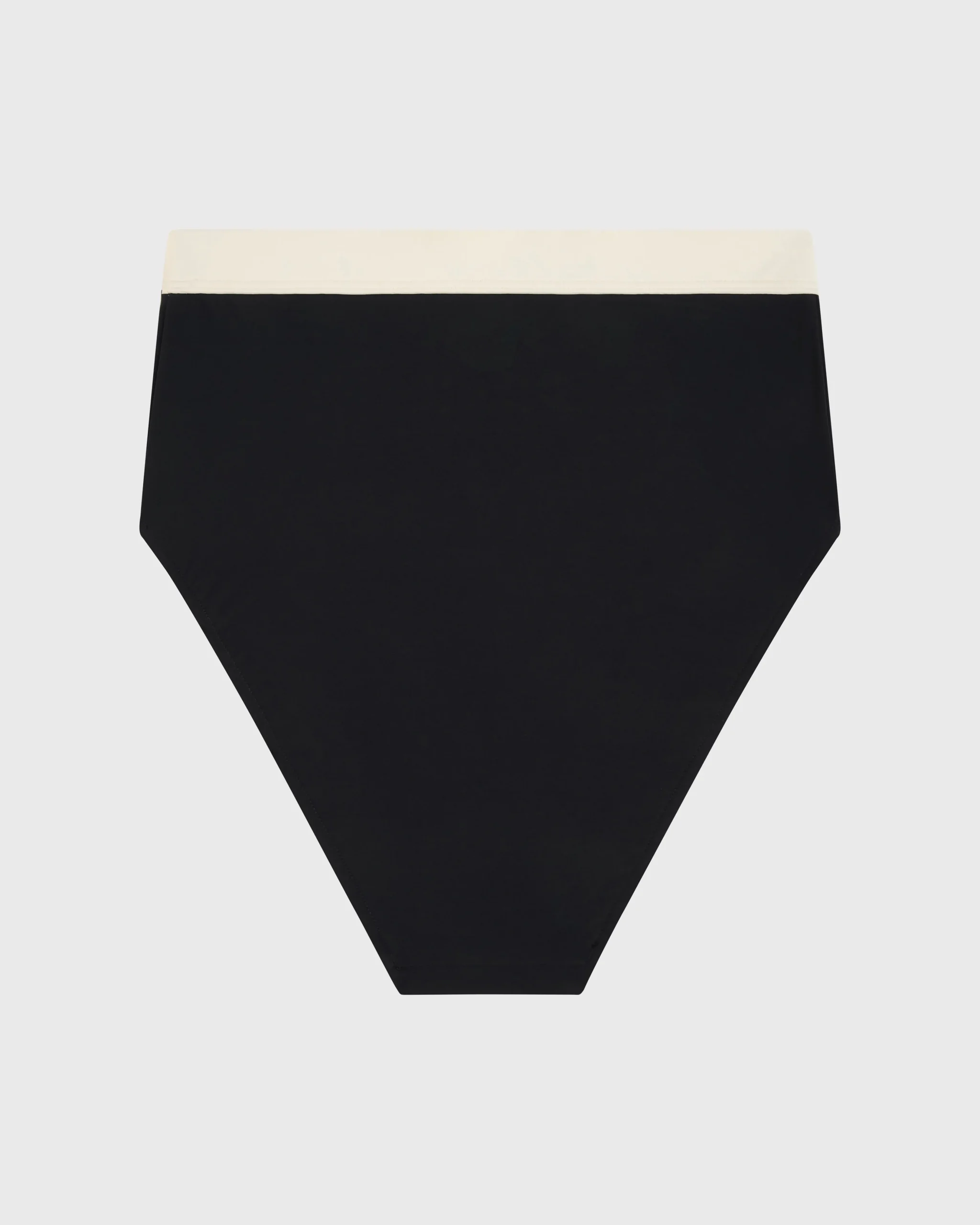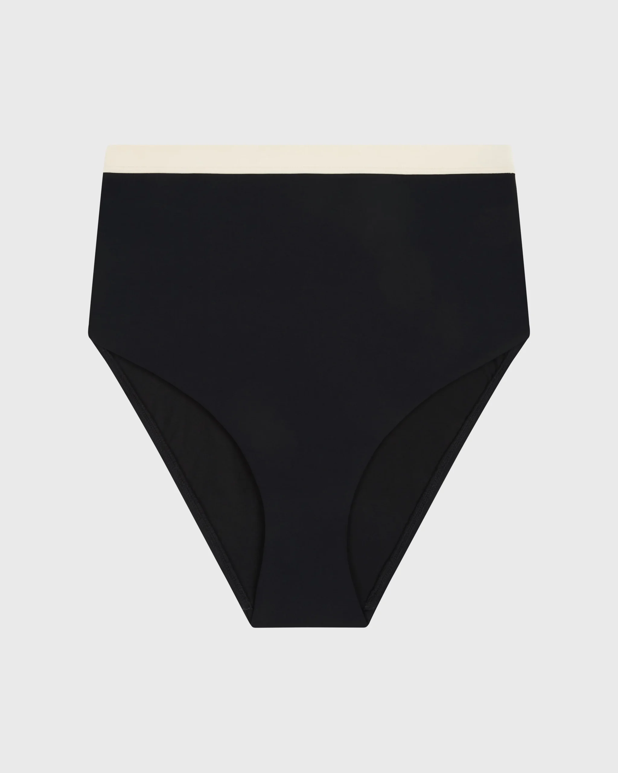 The Lina Bikini Bottom in Black is a high-waisted design featuring a contrasting white waistband for a modern, refined touch. Ending just above the waistline, this style offers strong tummy control and smooths the silhouette with the support of our advanced Sculpteur® fabric. Perfectly paired with the matching Lya Bikini Top in Black, the Lina is a sleek and flattering choice for any swim wardrobe.