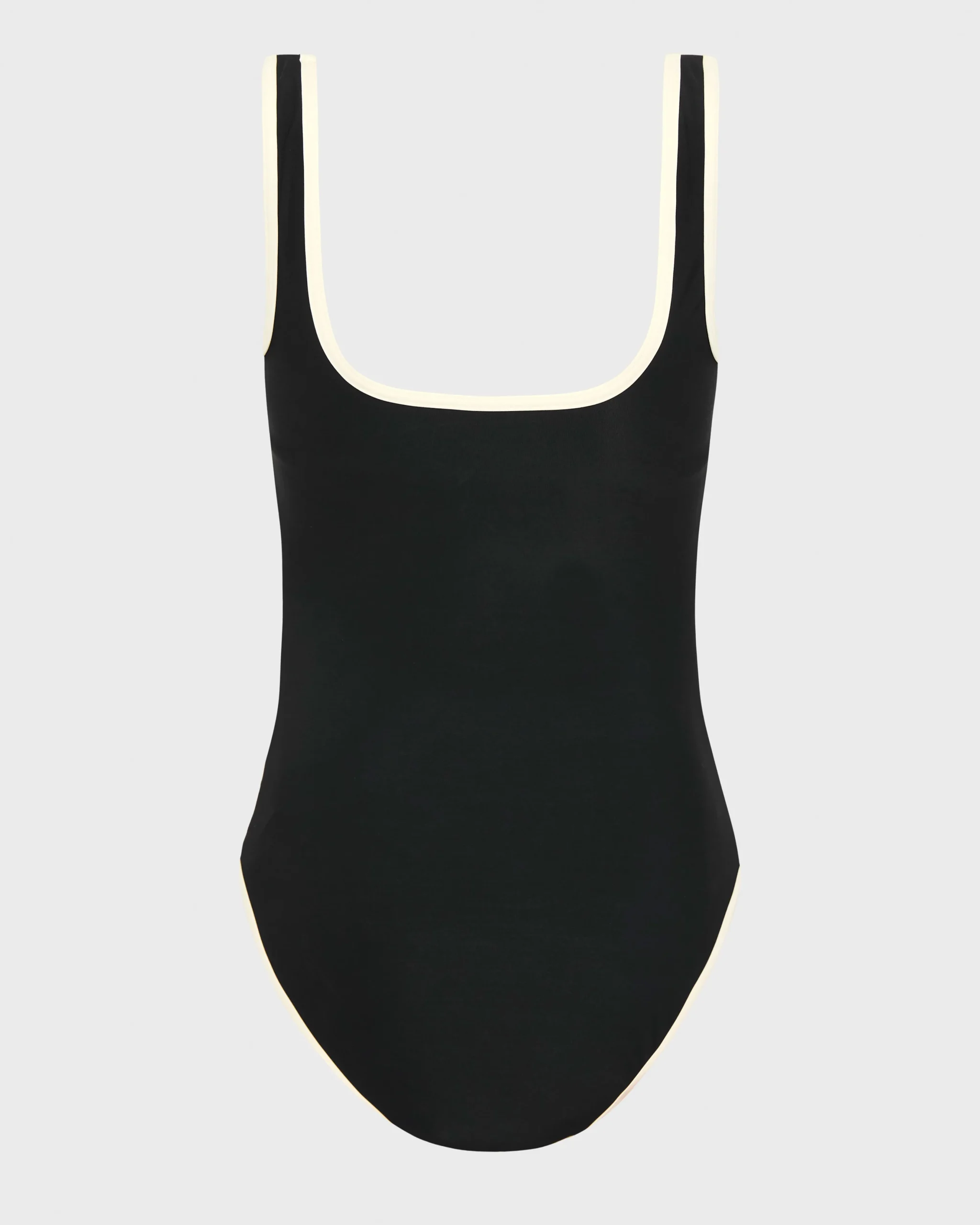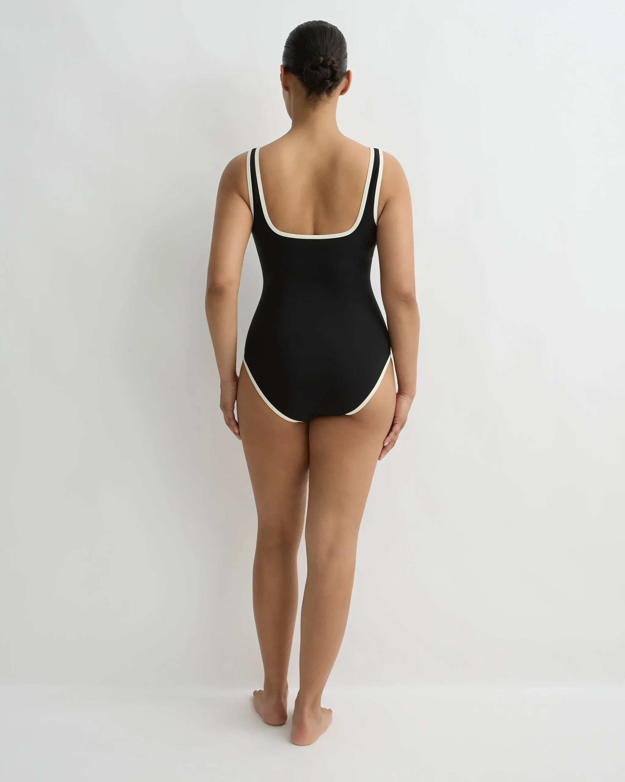 The McKenna One Piece in Black features a refined Pearl contrast trim, adding a subtle highlight to its clean lines. Based on Mackinley, one of our all-time best-selling silhouettes, McKenna is crafted from our luxury Sculpteur® fabric, sustainably made and engineered with patented 3-D stretch technology in Italy. McKenna supports, smooths and perfects the silhouette while offering invisible under-bust support and a regular leg line. Designed to suit most body types, provide tummy control, and fit bust sizes from A to DD+, McKenna is self-lined with a lighter, luxuriously soft version of Sculpteur® for supreme comfort. The fabric lasts up to 10 times longer than standard swim fabrics, making this a timeless and enduring addition to any swim wardrobe.