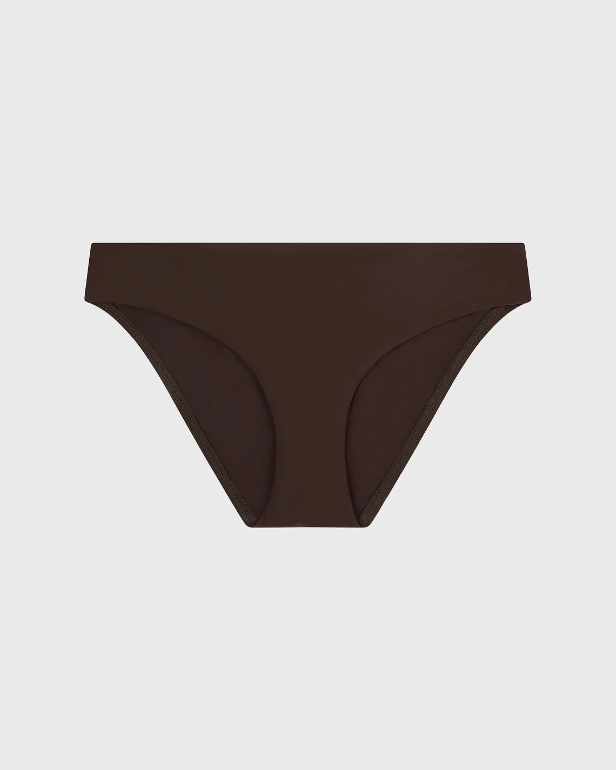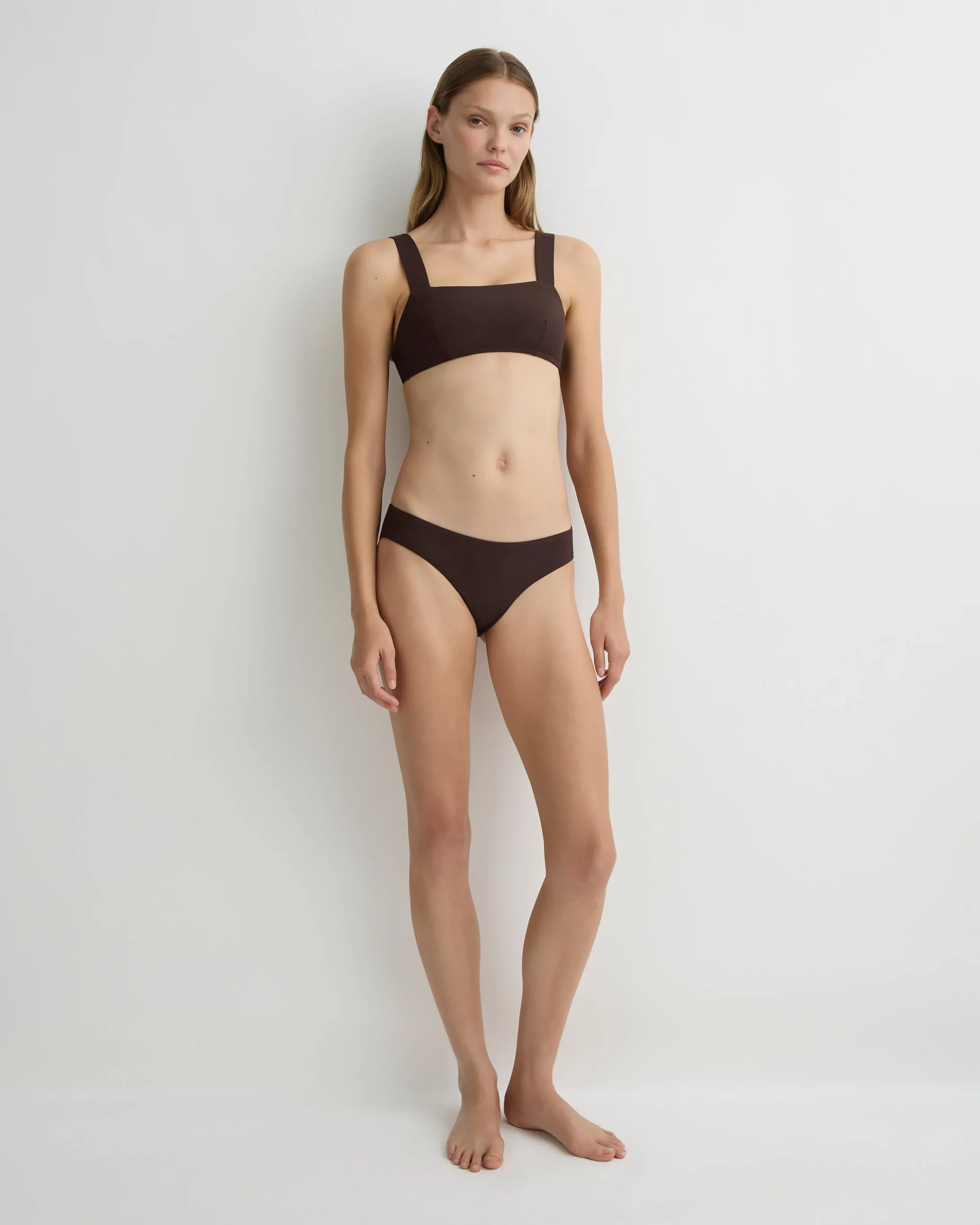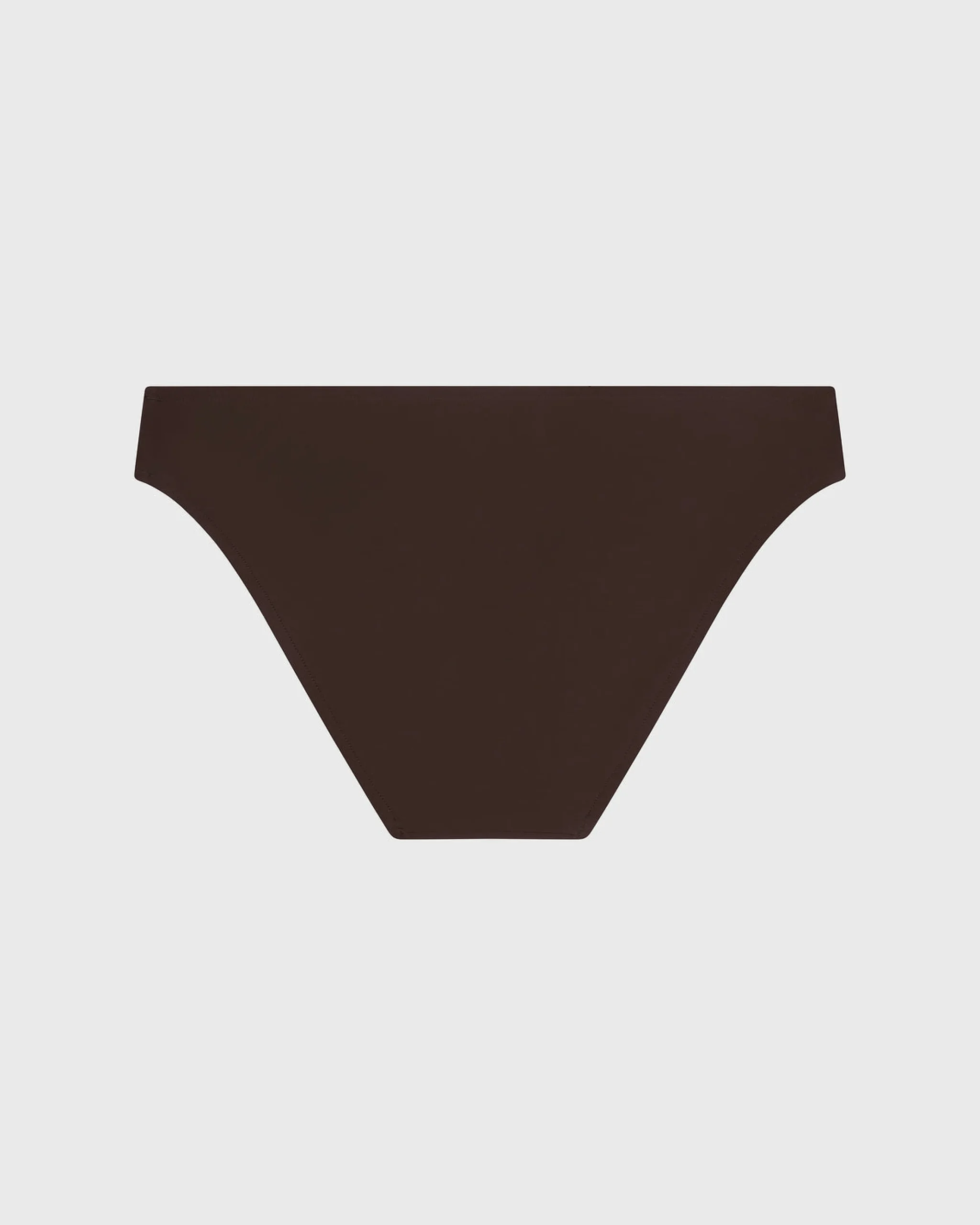 The Nadia Bikini Bottom in rich Mocha brown is a classic midi bikini bottom, cut from our luxury, Italian Sculpteur® fabric with patented 3-D stretch. Nadia has a subtle scoop at centre front to flatter the stomach and a regular cut leg and bottom.