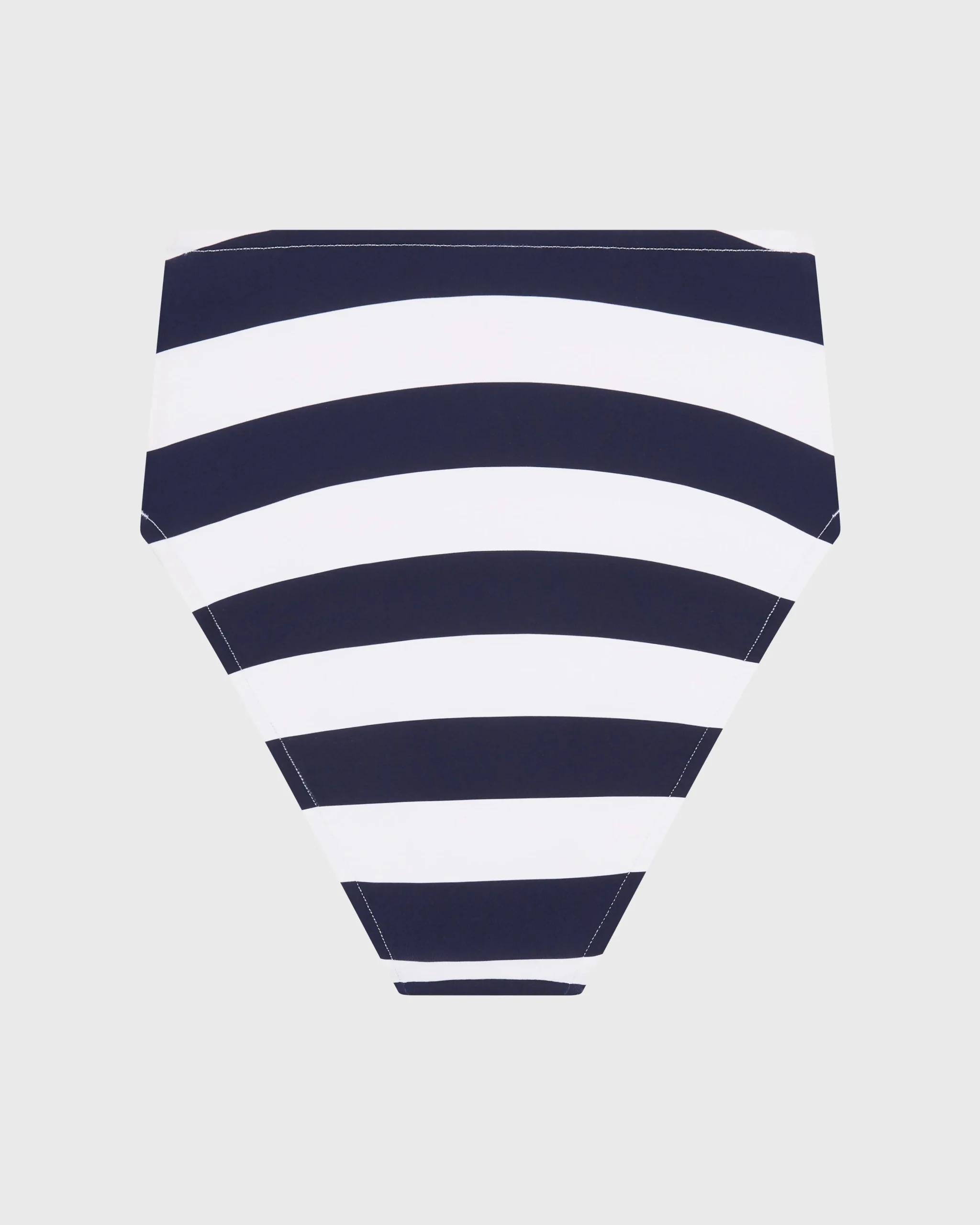Fresh and nautical, the Poppy Bikini Bottom in Navy & White Stripe offers a playful take on a classic high-waist style. Made from our luxuriously soft Italian Embodee™ fabric, which is sustainably crafted, Poppy is self-lined for supreme comfort and gentle shaping power that refines the silhouette. A sporty high-cut leg line lengthens the legs while maintaining confident coverage.